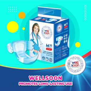 – Wellsoon incontinence diapers feature an outstanding odor-controlling absorbent core and multidirectional air channels that facilitate rapid absorption, moisture release, odor prevention and maintaining a consistently dry, clean surface.
